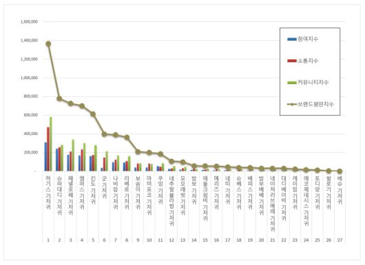 브랜드평판지수는 소비자들의 온라인 습관이 브랜드 소비에 큰 영향을 끼친다는 점을 분석한 지표로, 브랜드에 대한 긍부정 평가, 미디어 관심도, 소비자의 참여와 소통량, 소셜 대화량으로 측정된다. 신제품런칭센터에서 분석한 브랜드 유통에 대한 평가도 포함됐다.