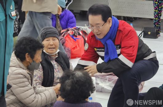 [무안=뉴스핌] 조은정 기자 = 김영록 전남도지사가 22일 광양시 옥곡면 산불현장을 방문, 지역 주민들을 위로하고 있다. [사진=전남도] 2026.01.22 ej7648@newspim.com