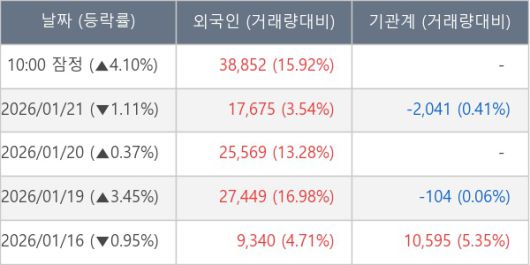 [서울=뉴스핌] 로보뉴스 = 22일 10시 15분 현재 티에스아이(277880)는 전일 대비 4.10% (현재가 5,580원) 상승했고, 외국인이 최근 6일 연속 순매수(누적 20.22만 주, 잠정) 행진을 하고 있다.