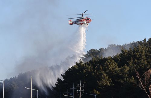 소방, 산림청, 경찰, 기장군청 공무원 등 340명을 투입해 야산을 둘러싼 방어선을 구축하고, 일출과 동시에 17대의 헬기가 투입했습니다.