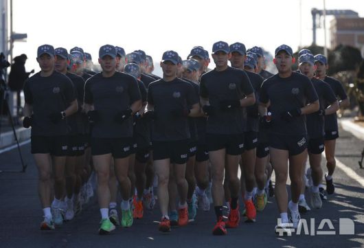 [창원=뉴시스] 정병혁 기자 = 해군 특수전전단 해난구조전대(SSU) 소속 심해잠수사들이 22일 경남 창원시 진해구 진해군항에서 열린 2026년 혹한기 내한훈련에서 단체달리기를 하고 있다. 2026.01.22. jhope@newsis.com |