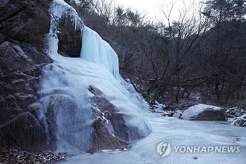 (양주=연합뉴스) 임병식 기자 = 한파특보가 발효 중인 22일 오전 경기도 양주시 사패산에서 원각폭포가 얼어 붙어 빙벽을 이루고 있다. 2026.1.22
