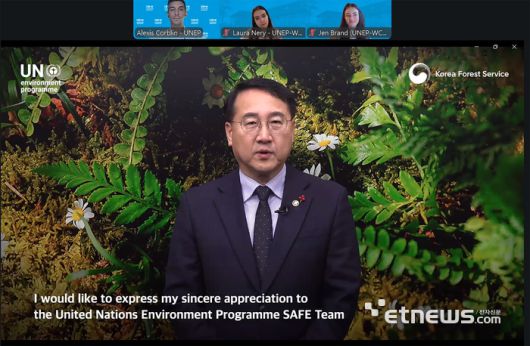 김인호 산림청장이 유엔환경계획(UNEP)과 유엔환경계획 세계자연보전 모니터링센터(UNEP-WCMC)가 공동 주최한 취약 산림생태계복원 이니셔티브(SAFE) 산림복원 모니터링 화상 토론회에 참여했다. |