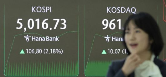 22일 오전 서울 중구 하나은행 본점 딜링룸 현황판에 코스피 지수가 장중 5000p를 넘으며 개장하고 있다. /사진=박지혜 기자 |