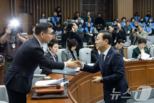 (서울=뉴스1) 이승배 기자 = 22일 서울 여의도 국회에서 열린 제431회국회(임시회) 국토교통위원회 12.29 여객기 참사 진상규명을 위한 국정조사특별위원회 청문회에서 김윤덕 국토교통부 장관이 증인선서문을 이양수 위원장에게 제출한 뒤 인사 나누고 있다. 2026.1.22/뉴스1