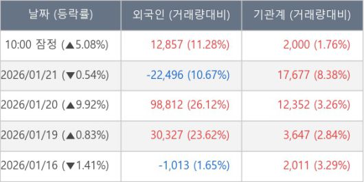 [서울=뉴스핌] 로보뉴스 = 22일 10시 15분 현재 엔에프씨(265740)는 전일 대비 5.08% (현재가 4,865원) 상승했고, 기관이 최근 5일 연속 순매수(누적 37,687주, 잠정) 행진을 하고 있다.