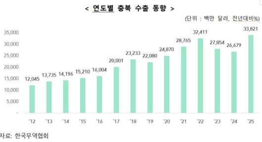 한국무역협회 충북지역본부 관계자는 "지난해 미국발 관세 충격과 글로벌 경기둔화 우려 속에서도 충북 수출이 역대 최고 실적을 경신한 점이 고무적"이라며 "반도체 외에도 배터리·바이오·화장품 등 도내 저변 산업의 수출이 동반 성장할 수 있도록 수출 국가와 품목을 다변화할 필요가 있다"고 말했다.