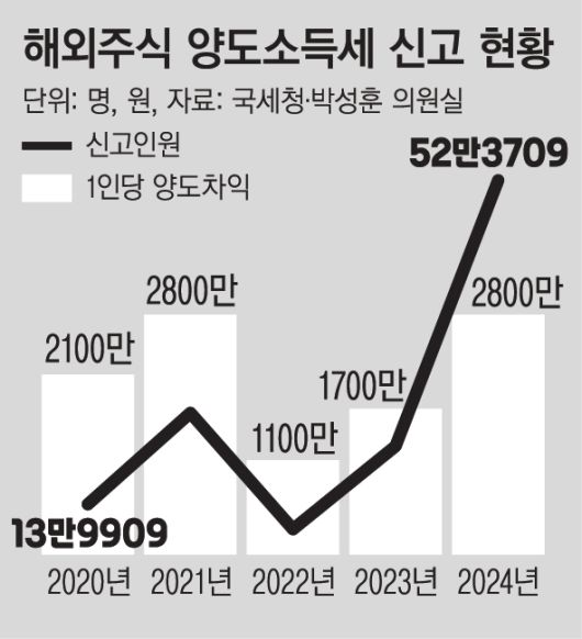 국회 재정경제기획위원회 소속 박성훈 국민의힘 의원이 22일 공개한 국세청의 ‘최근 5년간 해외주식 양도소득세 신고 현황’ 자료를 보면, 2024년 귀속 해외주식 양도소득세 신고인원은 52만3709명으로 집계됐다. 1년 전(20만7231명)보다 2.5배 이상 늘어 사상 처음 50만명을 넘어섰다.