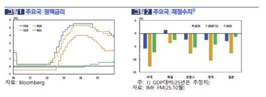 주요 선진국 중에선 올해에도 큰 폭의 재정 적자가 이어질 것으로 예상되며 이는 통화정책 운용여력에 영향을 미치면서 정책 조정이 시장 기대와 다소 상이하게 전개될 가능성도 배제할 수 없다는 것이다. 특히 올해 상반기 미국 연방준비제도(Fed·연준) 이사회 의장 교체 등에 따라 연준 정책 독립성에 대한 우려가 확산될 경우 금리·달러화의 추가 하방 압력이 될 수 있다고 봤다.