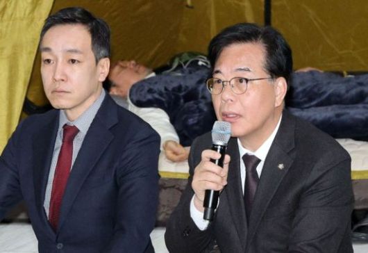 송언석 국민의힘 원내대표가 22일 장동혁 대표가 통일교·공천헌금 '쌍특검' 수용을 요구하며 여드레째 단식 농성을 벌이고 있는 국회 로텐더홀에서 열린 최고위원회의에서 발언하고 있다.