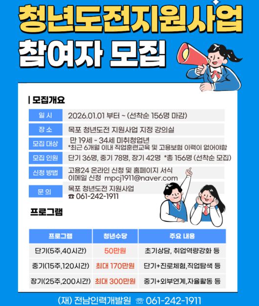 모집은 예산 소진 시까지 선착순으로 진행되며, 신청은 고용24 홈페이지 또는 이메일을 통해 가능하다. 사업 관련 자세한 사항은 목포 청년도전 지원사업팀(061-242-1911)으로 문의하면 된다.