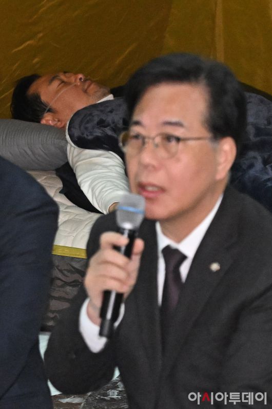 아시아투데이 송의주 기자 = 통일교·공천헌금 '쌍특검' 입법을 요구하며 8일째 단식 투쟁을 이어가는 장동혁 국민의힘 대표가 22일 국회 로텐더홀에서 열린 최고위원회의에 불참, 텐트에 누워있다. ⓒ "젊은 파워, 모바일 넘버원 아시아투데이"