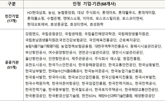 선정 기업에는 HD현대삼호, 농심, 농협중앙회, 롯데마트, 이마트, 포스코 계열사, 효성 계열사 등이 포함됐다. 공공기관은 한국농수산식품유통공사, 한국농어촌공사, 한국전력공사, 한국토지주택공사, 발전 공기업과 항만공사 등으로 폭넓게 구성됐다.