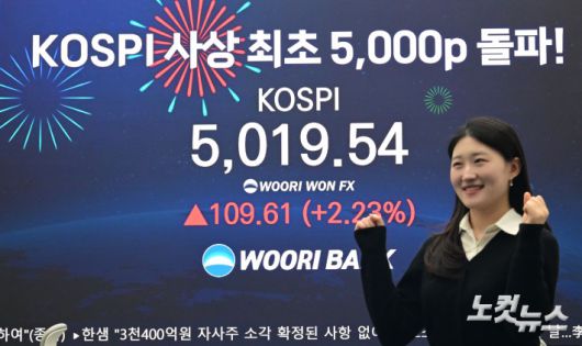 코스피가 꿈의 지수로 불렸던 '오천피'를 역사상 처음으로 돌파하며 코스피 5000 시대를 연 22일 오전 서울 중구 우리은행 딜링룸 현황판에 지수가 표시돼 있다.