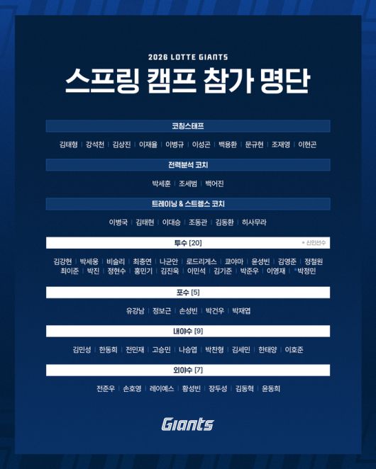 이번 캠프에는 투수 20명, 포수 5명, 내야수 9명, 외야수 7명 등 총 41명의 선수단이 참가한다. 2026 시즌 신인으로는 투수 박정민 선수가 스프링캠프에 합류한다. 로드리게스, 비슬리 선수는 1월 25일, 레이예스 선수는 2월 1일 체류 중인 지역에서 출발해 대만으로 이동한다. 지난 1월 15일에 국내에 입국해 상동에서 개인 훈련 중인 쿄야마 선수는 선수단과 함께 캠프 일정을 소화할 예정이다.