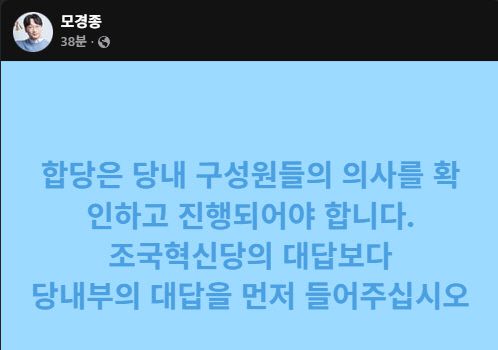 모경종 의원은 22일 자신의 페이스북을 통해 "합당은 당내 구성원들의 의사를 확인하고 진행돼야 한다"며 "조국혁신당의 대답보다 당 내부의 대답을 먼저 들어달라"고 밝혔다.