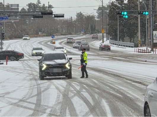많은 눈이 내린 22일 제주경찰이 도로 통제에 나서고 있다. 제주경찰청 제공 |