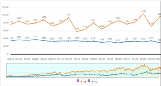 수출 품목별로 보면 국제 반도체 경기 회복에 힘입어 메모리반도체 수출이 뚜렷한 증가세를 보여 충남 수출 회복을 이끌었다. 다만, 비메모리 반도체와 디스플레이, 석유화학 등 일부 품목에서는 감소세가 이어져 산업 간 회복 속도 차이가 벌어진 모습도 보였다.