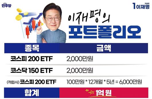 이 대통령은 대선 후보 시절이던 지난해 5월 28일 ‘코스피 5000 시대’를 공약하며 국내 주가지수 ETF에 4000만원을 투자한 바 있다. 아울러 향후 5년간 매월 100만원씩 6000만원을 추가로 투자해 총 1억원어치의 ETF를 매수하겠다고 약속했다.