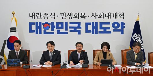 아시아투데이 송의주 기자 = 한병도 더불어민주당 원내대표(가운데)가 22일 국회에서 열린 정책조정회의에서 발언을 하고 있다.