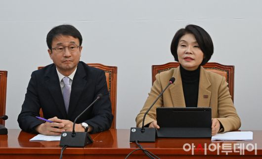 아시아투데이 송의주 기자 = 한정애 더불어민주당 정책위의장이 22일 국회에서 열린 정책조정회의에서 발언을 하고 있다. 왼쪽은 한병도 원내대표. ⓒ "젊은 파워, 모바일 넘버원 아시아투데이"