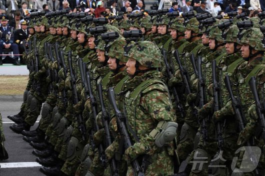 지난 2018년 10월 14일(현지시간) 일본 사이타마현 아사카 훈련장에서 열린 자위대 사열식 모습. 2018.10.14 ⓒ AFP=뉴스1 ⓒ News1 김지완 기자 |
