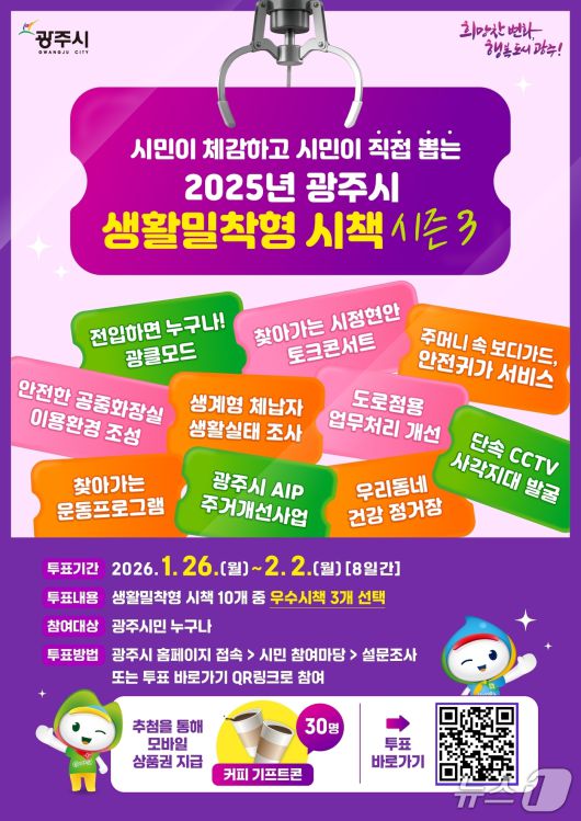 (경기광주=뉴스1) 김평석 기자 = 경기 광주시가 지난해 추진한 생활밀착형 시책 가운데 시민 체감도가 가장 높은 정책을 선정하기 위해 26일부터 2월 2일까지 시민 온라인 투표를 실시한다.