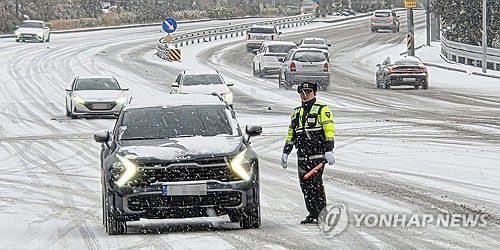(제주=연합뉴스) 폭설이 내린 22일 오전 제주시 아라동 제주대사거리에서 경찰이 한라산을 지나는 산간도로인 5·16도로로 향하는 차량 진입을 통제하고 있다. 2026.1.22 [제주경찰청 제공, 재판매 및 DB 금지]