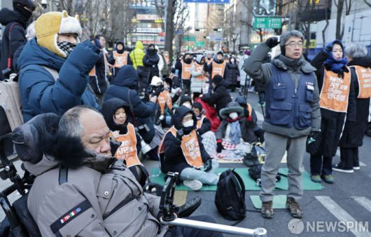 [서울=뉴스핌] 양윤모 기자 = 오이도역 리프트 추락참사 25주기를 맞아 전국장애인차별철폐연대와 민주노총이 22일 오전 '오세훈 서울시장 장애인권리약탈 STOP! 촉구 결의대회'를 서울시청 동편에서 개최 했다.  참석자들은 ‘약자와의 동행’이라는 구호 아래 감춰진 서울시의 기만적 행정을 폭로하며 오세훈 서울시장에 의해 하루 아침에 강행된 권리중심 최중증 장애인 맞춤형 공공일자리 폐지를 규탄했다. 2026.01.22 yym58@newspim.com