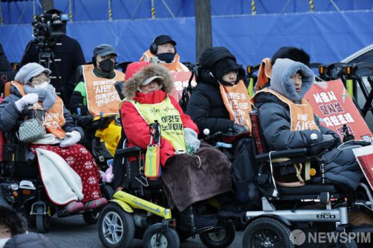 [서울=뉴스핌] 양윤모 기자 = 오이도역 리프트 추락참사 25주기를 맞아 전국장애인차별철폐연대와 민주노총이 22일 오전 '오세훈 서울시장 장애인권리약탈 STOP! 촉구 결의대회'를 서울시청 동편에서 개최 했다. 참석자들은 ‘약자와의 동행’이라는 구호 아래 감춰진 서울시의 기만적 행정을 폭로하며 오세훈 서울시장에 의해 하루 아침에 강행된 권리중심 최중증 장애인 맞춤형 공공일자리 폐지를 규탄했다. 2026.01.22 yym58@newspim.com |