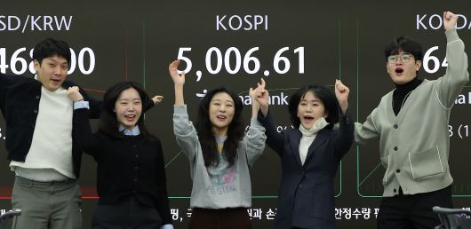 22일 오전 서울 중구 하나은행 본점 딜링룸 현황판에 코스피 지수가 장중 5000p를 넘으며 개장하자 직원들이 환호하고 있다. /뉴스1 |