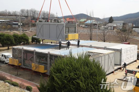 31일 오후 경북 안동시 일직면 망호리 권정생동화나라에 산불 피해 이재민을 위한 모듈러 주택 설치가 한창이다. 2025.3.31/뉴스1 ⓒ News1 공정식 기자 |