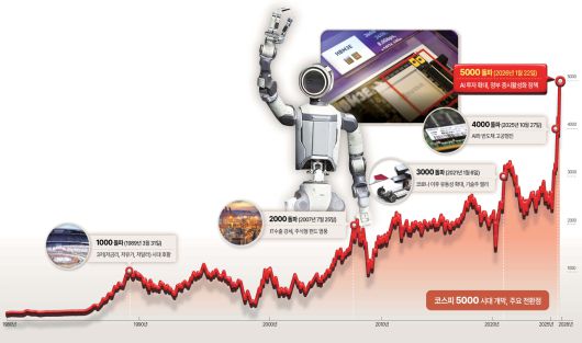 ▶3저호황에서 AI 반도체 열풍까지…코스피 5000까지 온 순간들=과거 코스피의 역사에서도 주도 섹터의 성장과 자본시장 상품 및 제도가 발전이 맞물릴 때 지수의 도약이 이뤄졌다. 1989년 코스피가 처음으로 1000포인트를 돌파했을 당시 중화학과 조선, 무역 수출주가 일등 공신으로 꼽혔다. 저유가 기조를 바탕으로 값싼 석유화학 원자재가 공급되면서 화학 산업의 수익성이 크게 개선됐다. 저금리 환경은 대규모 설비투자를 가능하게 했다. 여기에 원화 약세가 더해지며 수출 경쟁력이 강화되면서 철강·조선·전자 등 중화학 기반 산업 전반의 실적이 개선됐다.