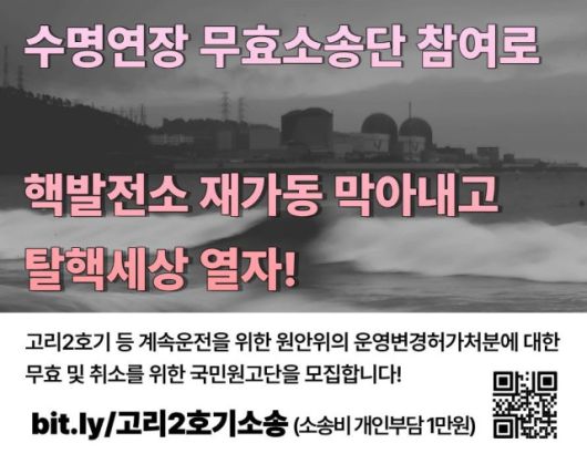 - 내용: 40년 설계수명이 만료된 고리2호기 계속운전(수명연장) 허가의 위법성을 묻는 시민소송