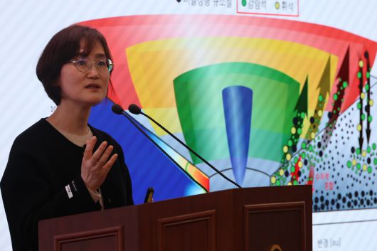 이정은 서울대 교수가 19일 정부세종청사 과학기술정보통신부에서 별이 생성될 때 규산염이 결정화되는 과정을 제임스 웹 우주망원경으로 관측하여 입증한 연구결과를 설명하고 있다. [연합] |
