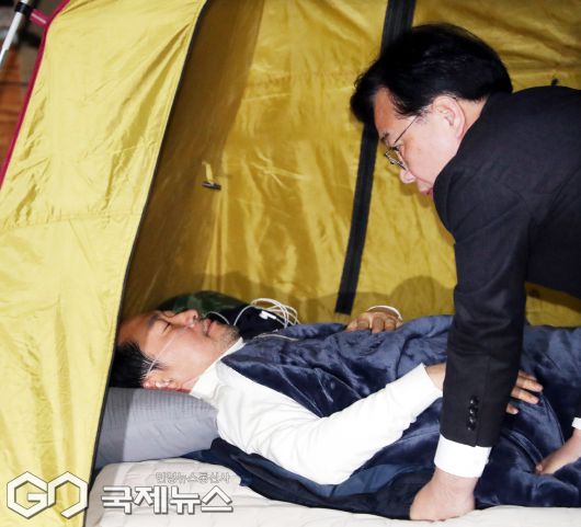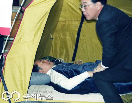 (서울=국제뉴스) 통일교·공천헌금 '쌍특검' 수용을 촉구하며 여드레째 단식중인 장동혁 국민의힘 대표가 21일 서울 여의도 국회 로텐더홀 농성장 텐트에서 송언석 원내대표와 대화하고 있다./사진=이용우 기자