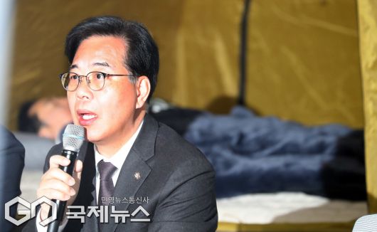 (서울=국제뉴스) 통일교·공천헌금 '쌍특검' 수용을 촉구하며 여드레째 단식중인 장동혁 국민의힘 대표가 21일 서울 여의도 국회 로텐더홀 농성장 앞에서 열린 최고위원회의에 불참한 채 텐트에 누워있다./사진=이용우 기자