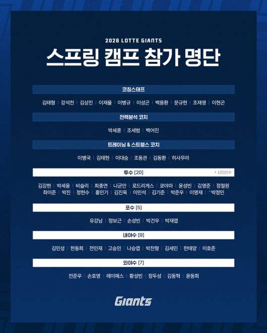 이번 캠프에는 투수 20명, 포수 5명, 내야수 9명, 외야수 7명 등 총 41명의 선수단이 참가한다. 2026시즌 신인으로는 투수 박정민이 스프링캠프에 합류한다.