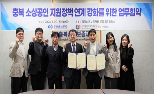 (청주=국제뉴스) 이재기 기자 = 충북신용보증재단(이사장 김창순, 이하 충북신보)은 22일 소상공인시장진흥공단 충북지역본부(본부장 노준호, 이하 소진공)와 소상공인의 경영 안정을 위해 '충북 소상공인 지원정책 연계 강화를 위한 업무협약'을 체결했다고 밝혔다.
