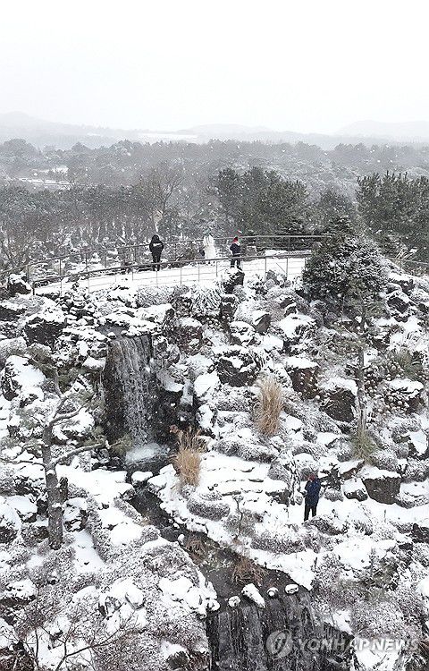 (제주=연합뉴스) 박지호 기자 = 제주도 산지에 대설특보가 내려진 22일 오전 제주시 구좌읍 송당리 동화마을을 찾은 관광객이 겨울 정취를 만끽하고 있다. 2026.1.22
