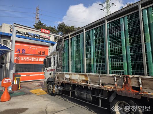 ▲ 축산차량이 소독을 위해 음암면에 있는 거점소독시설에서 대기하고 있다. |