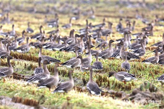 ▲ 지난해 102월 12일 서산 천수만 일원에서 관찰된 겨울 철새 모습을 촬열한 사진이다. |