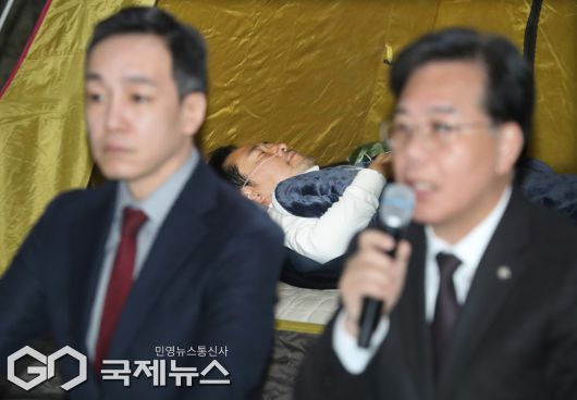 (서울=국제뉴스) 통일교·공천헌금 '쌍특검' 수용을 촉구하며 여드레째 단식중인 장동혁 국민의힘 대표가 21일 서울 여의도 국회 로텐더홀 농성장 앞에서 열린 최고위원회의에 불참한 채 텐트에 누워있다./사진=이용우 기자