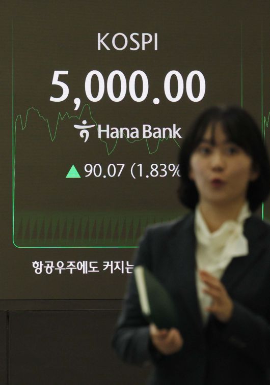 코스피가 사상 처음으로 장중 5000선을 돌파한 22일 오전 서울 중구 하나은행 본점 딜링룸 전광판에 코스피 등 시황이 표시되고 있다.