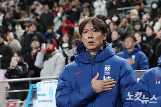 홍명보 대한민국 축구대표팀 감독이 18일 서울 상암동 서울월드컵경기장에서 열린 축구 국가대표팀 친선경기 대한민국과 가나의 경기에서 국민의례를 하고 있다. 류영주 기자 |