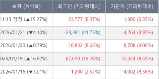[서울=뉴스핌] 로보뉴스 = 22일 11시 30분 현재 성일하이텍(365340)은 전일 대비 15.27% (현재가 56,600원) 상승했고, 기관이 최근 12일 연속 순매수(누적 12.50만 주, 잠정) 행진을 하고 있다.