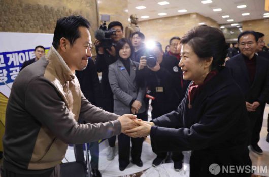 [서울=뉴스핌] 윤창빈 기자 = 박근혜 전 대통령이 22일 서울 여의도 국회 로텐더홀에서 통일교·공천헌금 '쌍특검' 수용을 요구하며 8일째 단식 중인 국민의힘 장동혁 대표를 찾아 대화하고 있다. 2026.01.22 pangbin@newspim.com