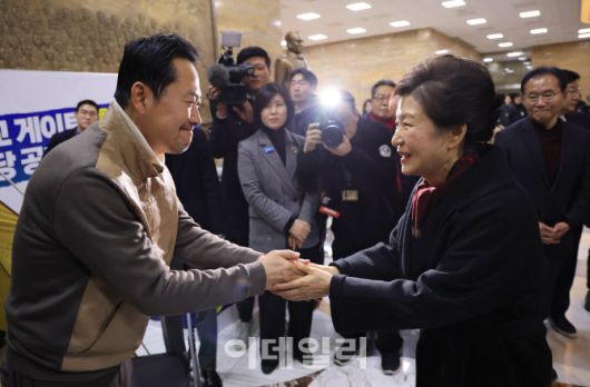 [이데일리 노진환 기자] 박근혜 전 대통령이 22일 서울 여의도 국회 로텐더홀에서 통일교·공천헌금 '쌍특검' 수용을 요구하며 8일째 단식 중인 장동혁 국민의힘 대표를 찾아 대화하고 있다.
