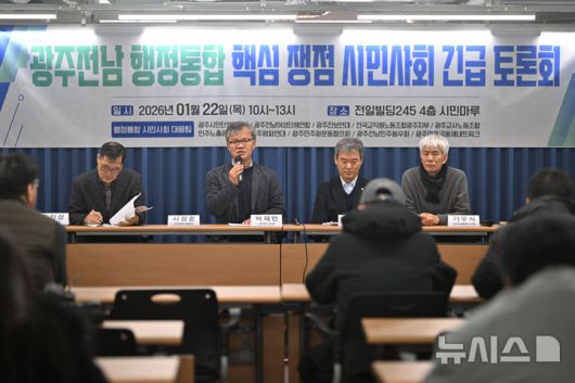 [광주=뉴시스] 이영주 기자 = 광주지역 시민단체들을 중심으로 이뤄진 행정통합시민사회대응팀이 22일 오전 광주 동구 전일빌딩245에서 광주전남 행정통합 핵심쟁점 시민사회 긴급토론회를 열고있다. 2026.01.22. leeyj2578@newsis.com |