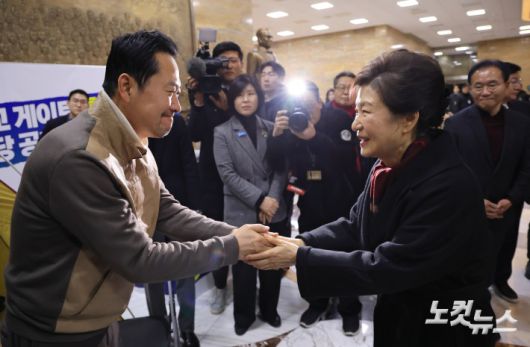 박근혜 전 대통령이 22일 서울 여의도 국회 로텐더홀에서 통일교·공천헌금 '쌍특검' 수용을 요구하며 8일째 단식 중인 국민의힘 장동혁 대표를 찾아 대화하고 있다.